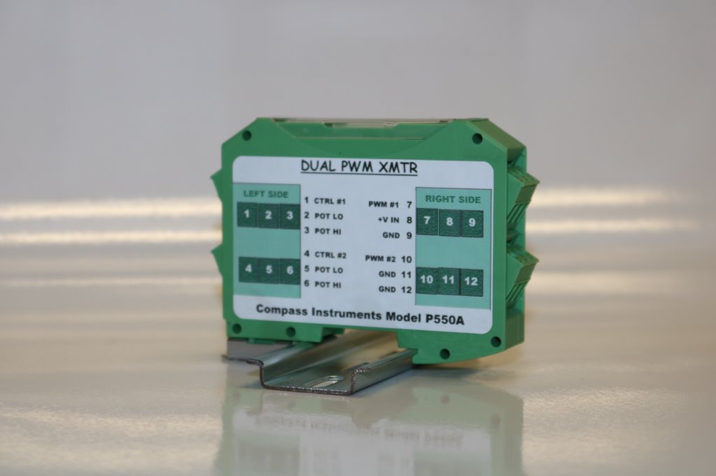 The Model P550A Dual PWM Transmitter is a heavy duty DIN rail mount module that uses two 0-5V signals (or 10K potentiometers) to develop two output pulse width modulated signals proportional to the respective inputs.
